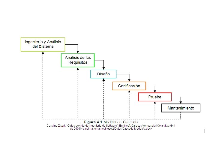 Modelo de Cascada (Bennington 1956, Modificado por Royce en 1970, Pressman lo presenta como ciclo de vida clásico). Se denomina modelo en cascada porque su característica principal es que no se comienza con un paso hasta que no se ha terminado el anterior.