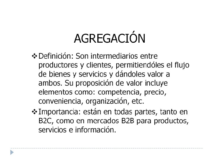 Agregador Tema principal: Selección y conveniencia Propuesta de Valor: Optimizar la selección, organización, precio, conveniencia Rol del cliente: comprador Foco del conocimiento: segmentación del mercado, Oferta de proveedores, abasto Proceso clave: Integración de la propuesta de valor Ejemplo: Wal Mart