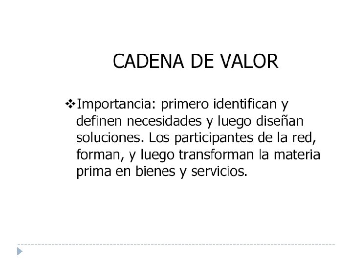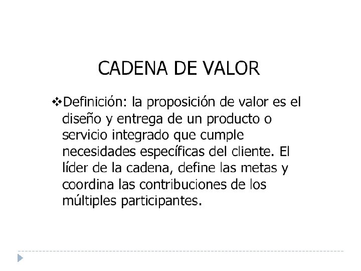 Cadena de Valor Tema principal: Integración de procesos Propuesta de Valor : Diseño y entrega bajo la integración de productos y servicios que cumplan con las necesidades del cliente Rol del cliente: conduce el valor Foco del conocimiento: Innovación, administración de la cadena de suministros Proceso clave: Diseño de producto, administración de la cadena de suministros Ejemplo: General Motors
