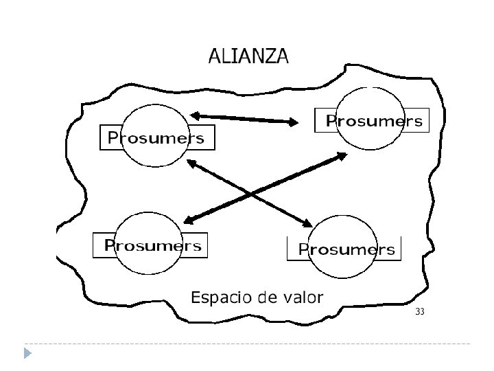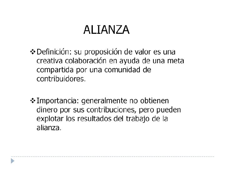 Alianza Tema principal: Creatividad Propuesta de Valor: Colaboración creativa, agrega un objeto común a lo largo de una comunidad que contribuye Rol del cliente: Contribuye Foco del conocimiento: Comunidad, creatividad, estándares y roles Proceso clave: Innovación Ejemplo: wikipedia