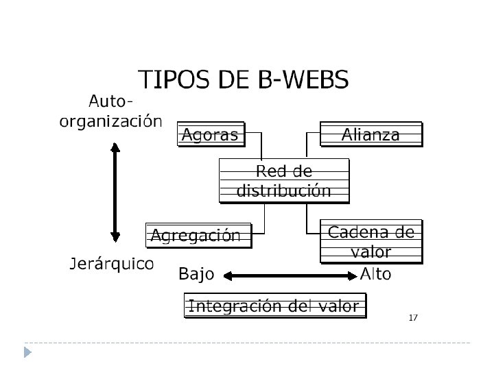9 características de una b-web 1. Infraestructura en Internet: Los participantes de la b-web utilizan la habilidad de Internet para poder reducir los costos de transacción. Usan Internet como su infraestructura primaria para sus comunicaciones y transacciones de negocios. 2. Propone un valor innovador: Los participantes del b-web general un valor único que hacer ver a los viejos valores como obsoletos
