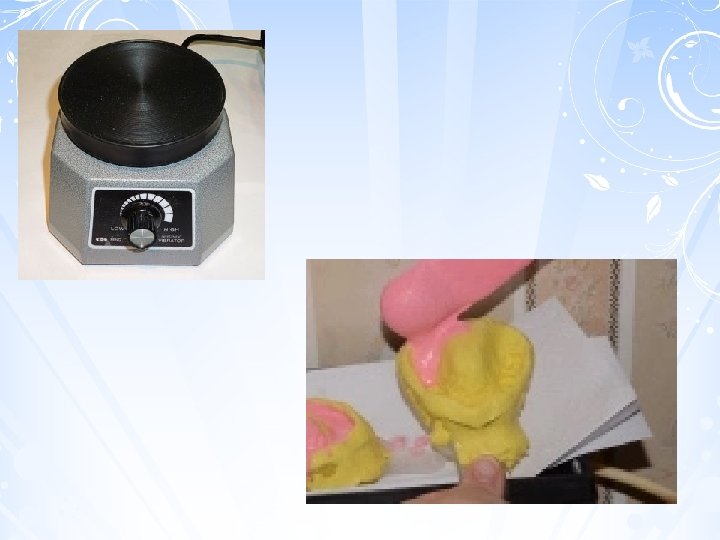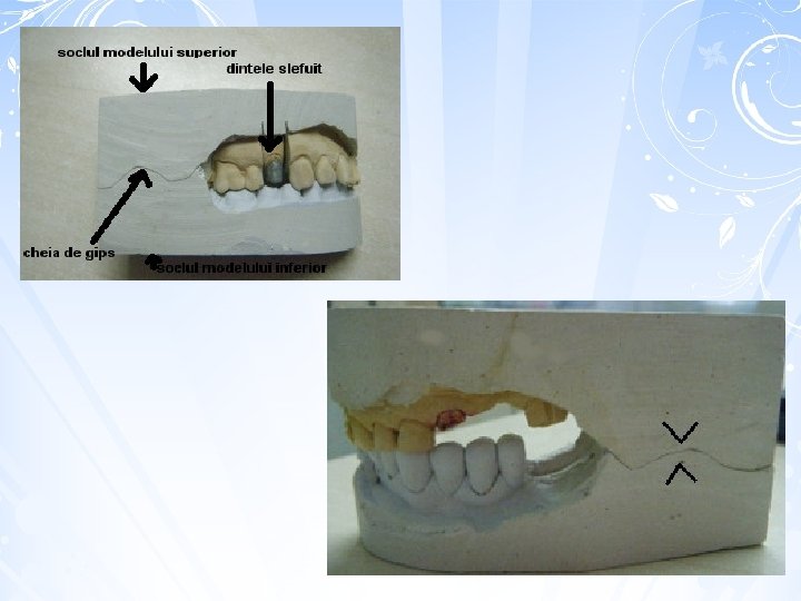 Dupa umplerea coroanelor se continua depunerea treptata a pastei pe acelasi perete interior pana la acoperirea totala a amprentei, cu vibrare permanenta. Apoi se realizeaza soclul modelului cu inaltimea de 2 cm care prezinta, in partea distala, o prelungire cu suprafata la nivelul suprafetelor ocluzale dintilor. Cand ghipsul s-a intarit, pe suprafata superioara a prelungirilor se taie o cheie de ocluzie in forma literei T, Y care formeaza cheia ce da posibilitatea de asamblare corecta a celor doua modele. Modelul dintilor antagonisti se toarna in impresiunile amprentei existente pe partea opusa unde sa turnat primul model. Demularea amprentei de pe model este posibila dupa cel putin 60 de minute de la turnare. Este operatiunea care desprinde in fragmente amprenta, folosindu-se un ciocan de corn si o spatula.