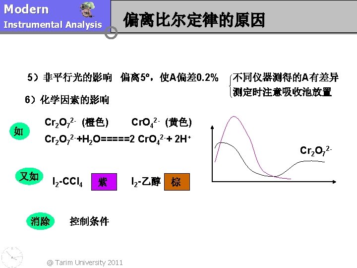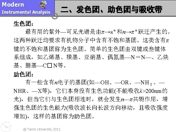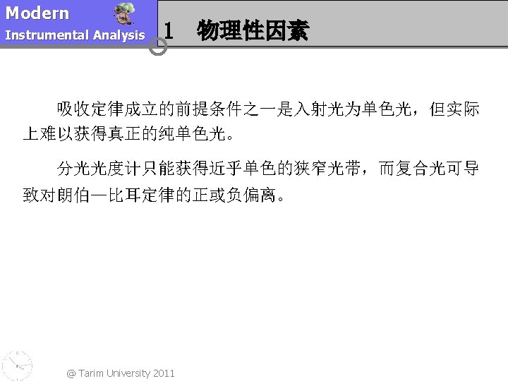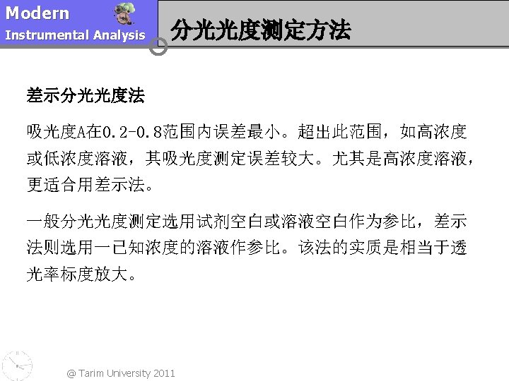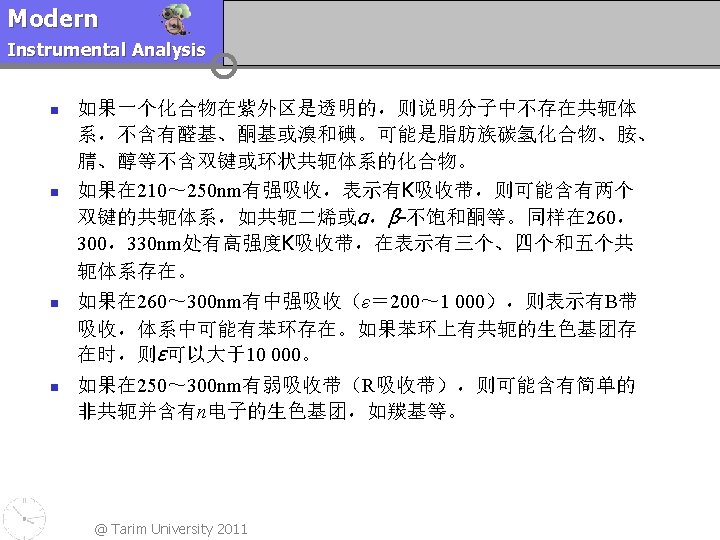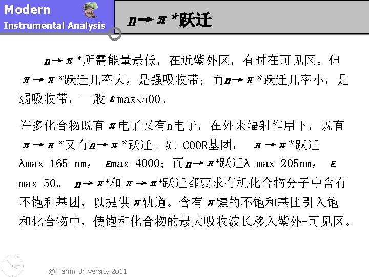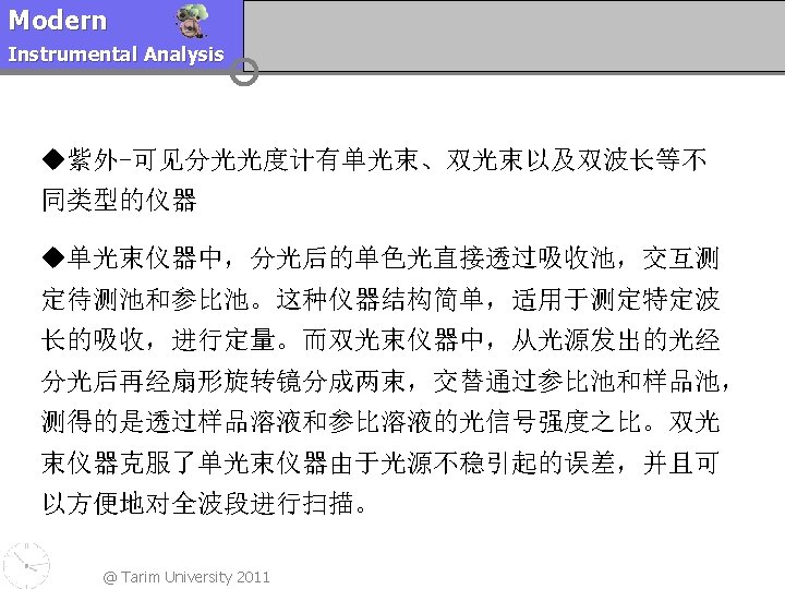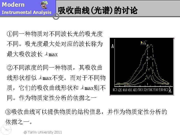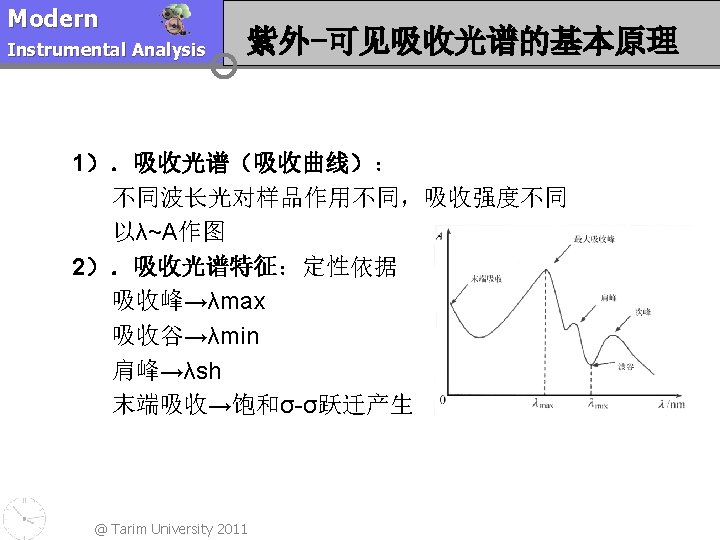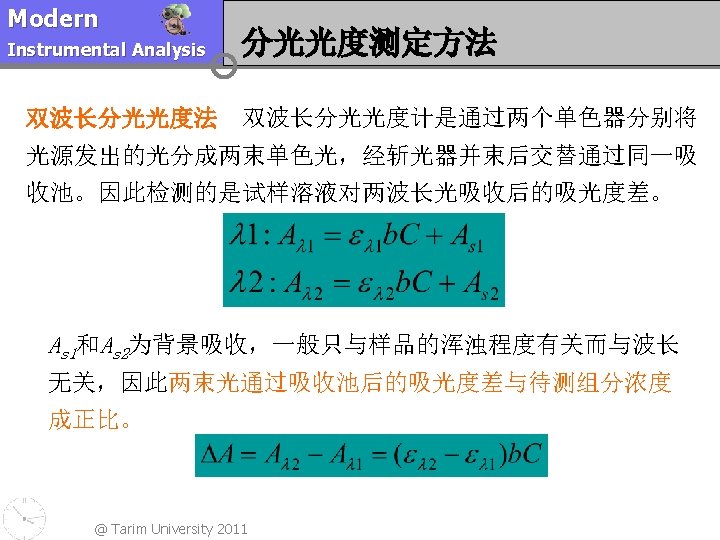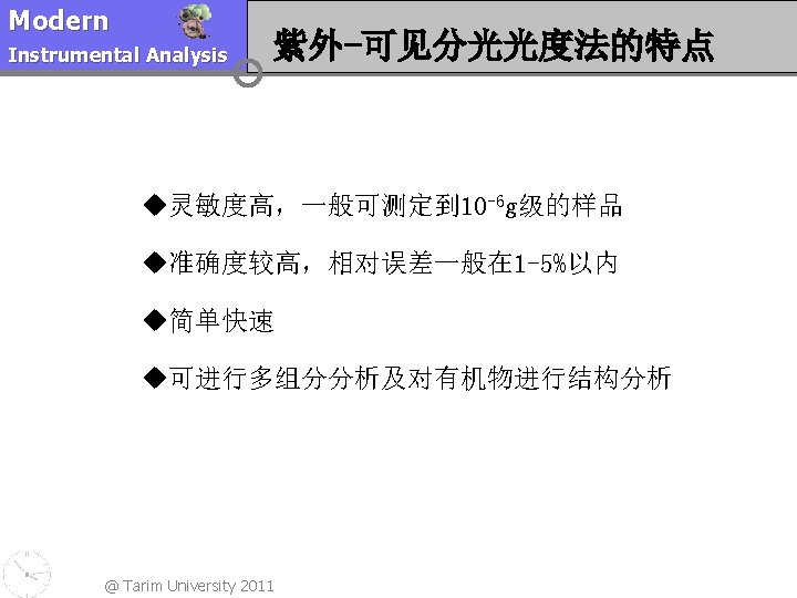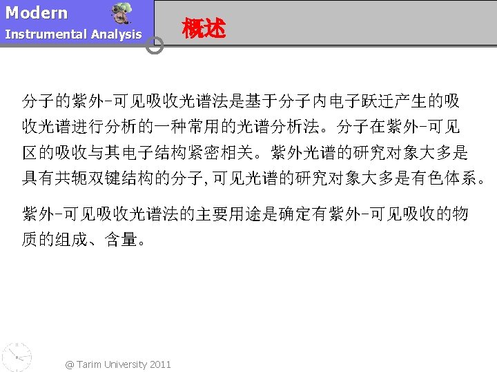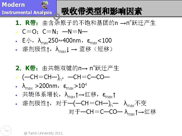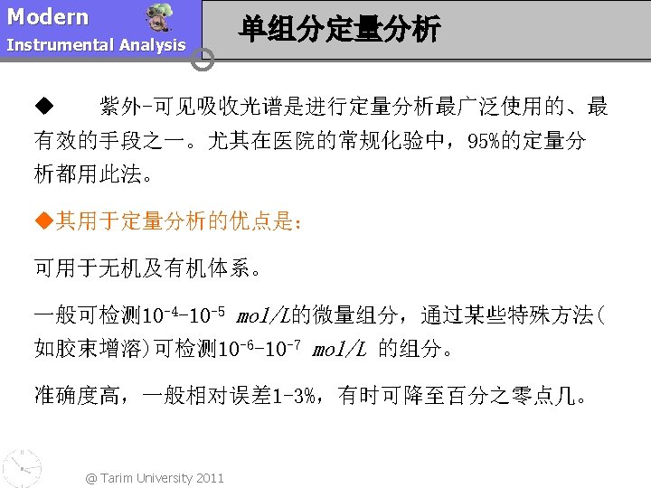 Modern Instrumental Analysis 2. 定量分析 依据:朗伯-比耳定律 吸光度: A= b c 透光度:-lg. T = b c 灵敏度高: max: 104~ 105 L· mol-1 · cm -1;(比红外大) @ Tarim University 2011