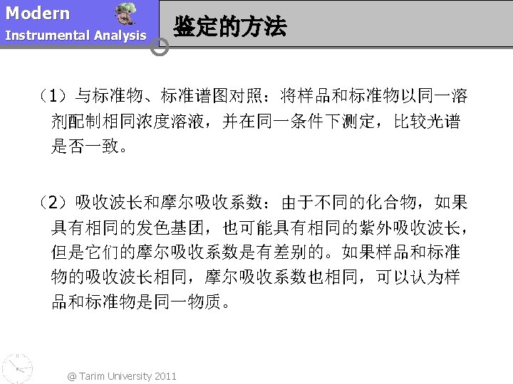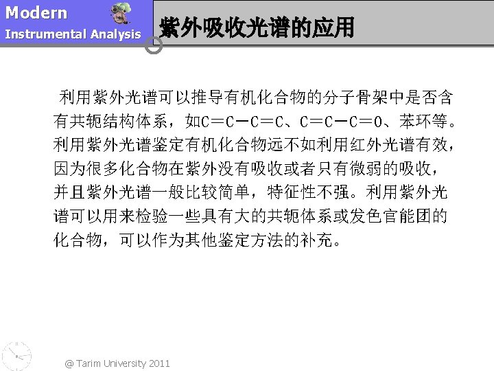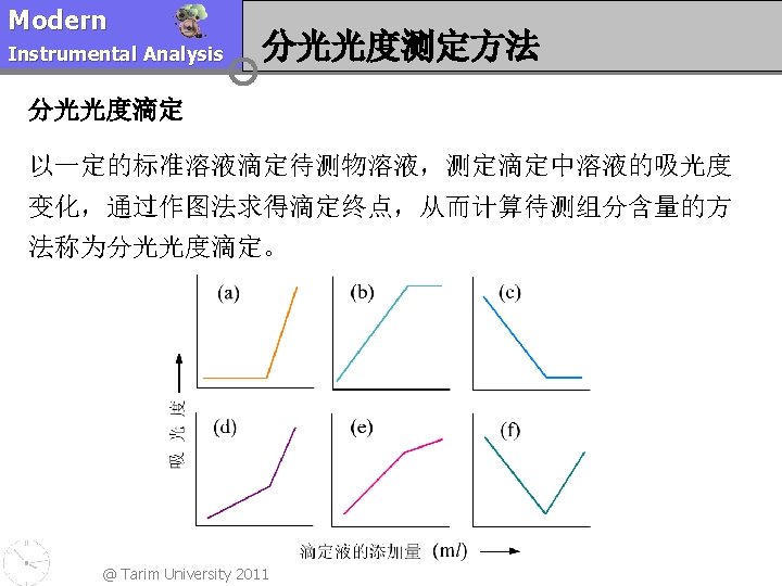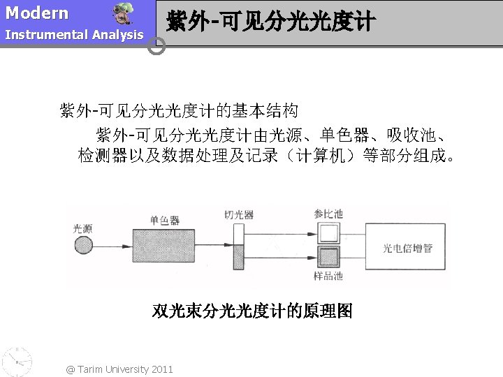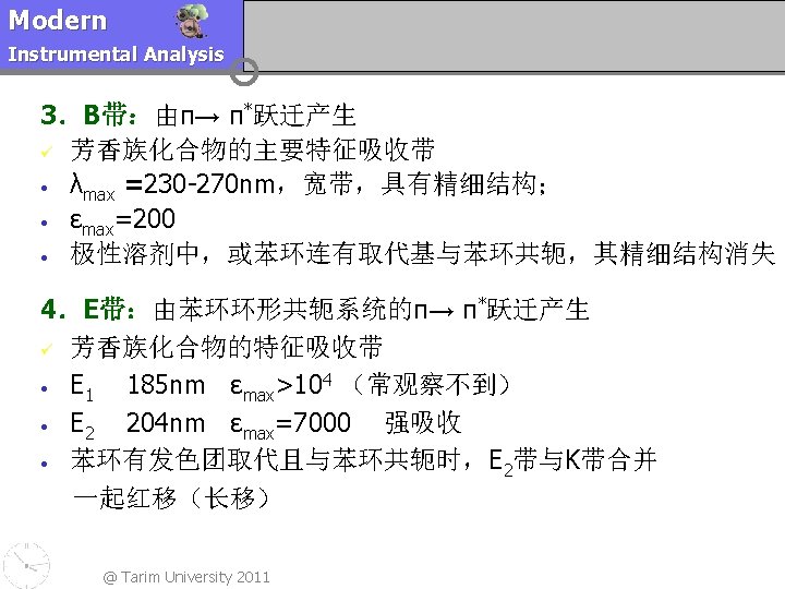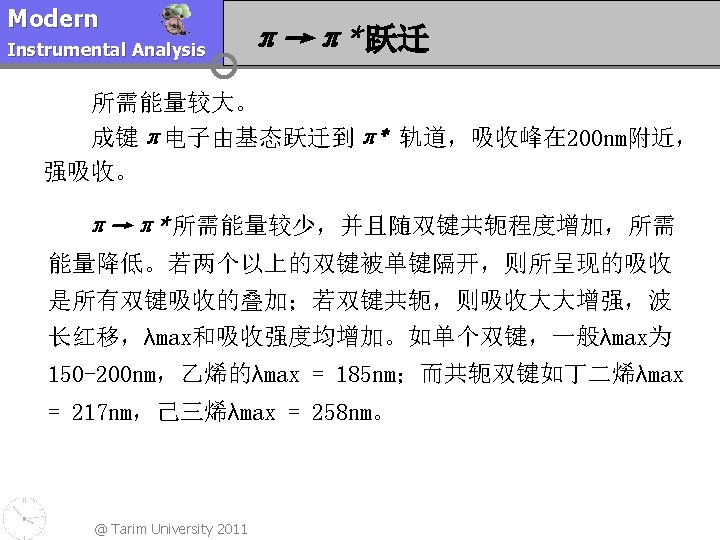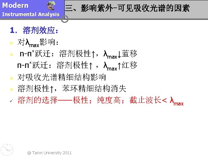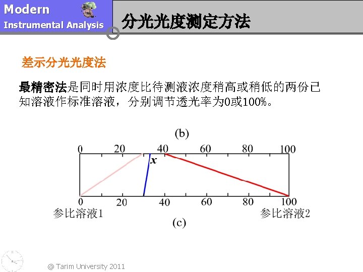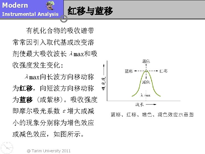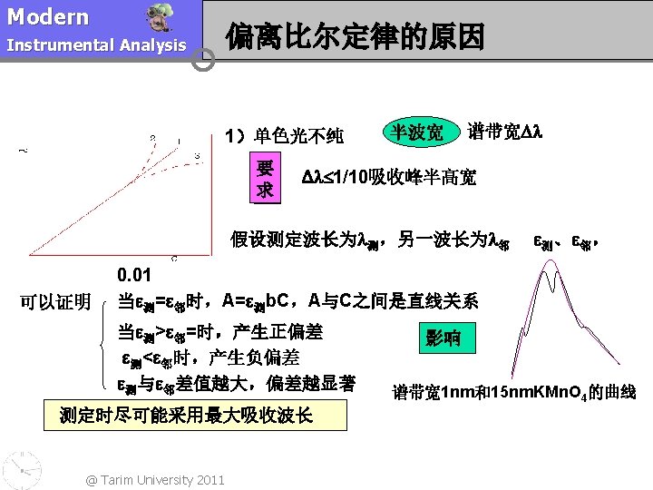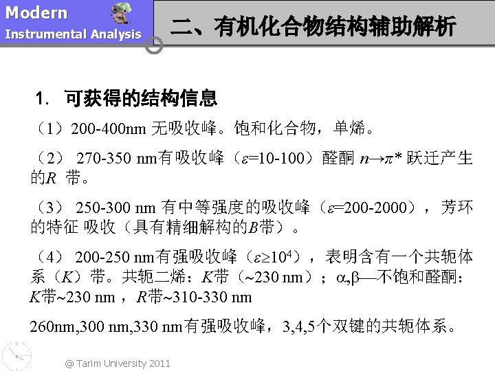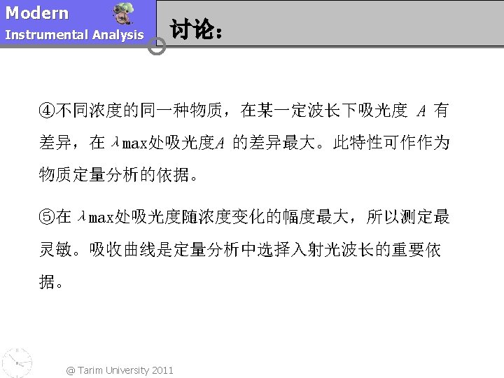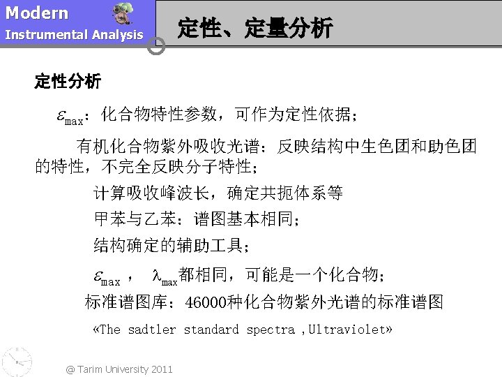 Modern Instrumental Analysis 2. 定量分析 依据:朗伯-比耳定律 吸光度: A= b c 透光度:-lg. T = b c 灵敏度高: max: 104~ 105 L· mol-1 · cm -1;(比红外大) @ Tarim University 2011