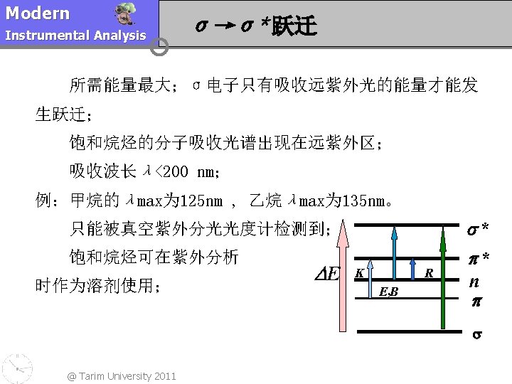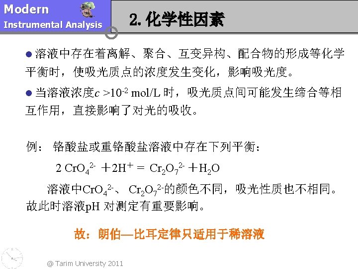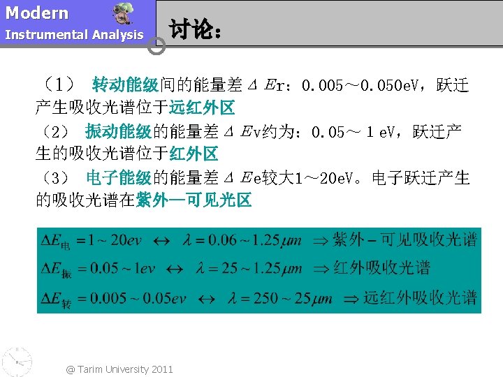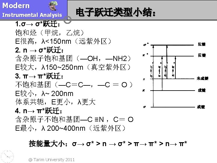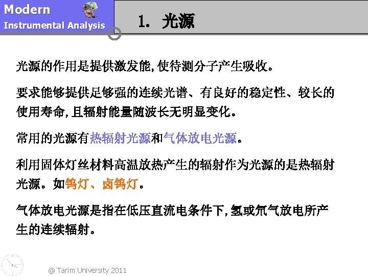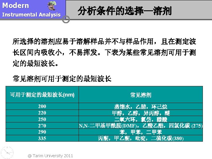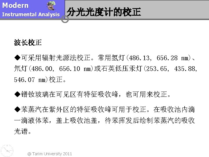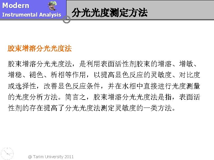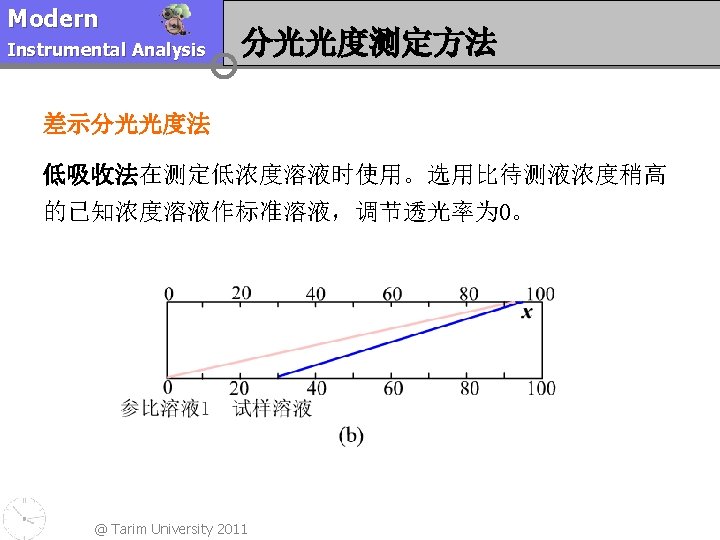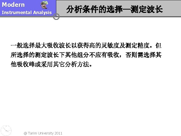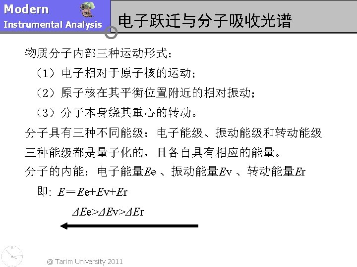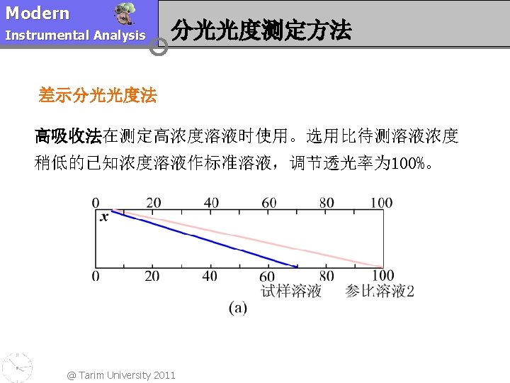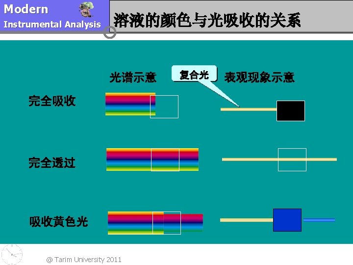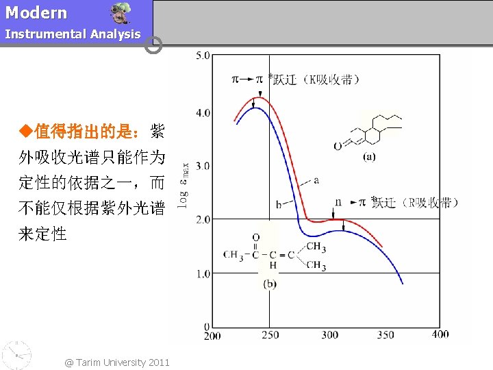 Modern Instrumental Analysis 2. 定量分析 依据:朗伯-比耳定律 吸光度: A= b c 透光度:-lg. T = b c 灵敏度高: max: 104~ 105 L· mol-1 · cm -1;(比红外大) @ Tarim University 2011