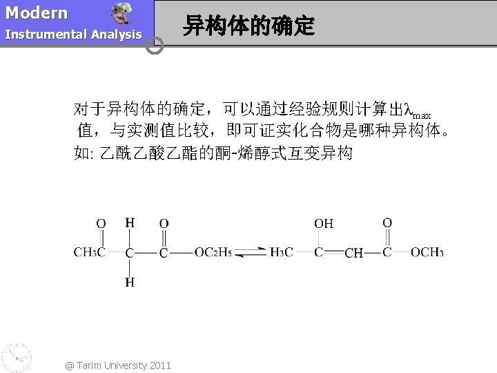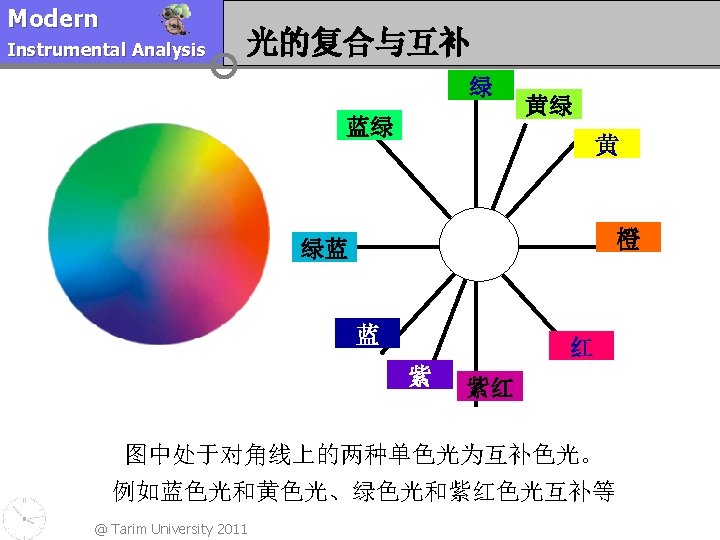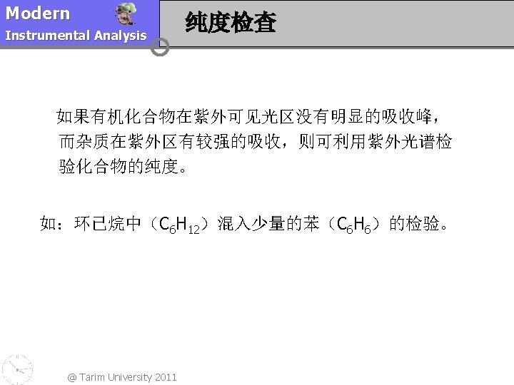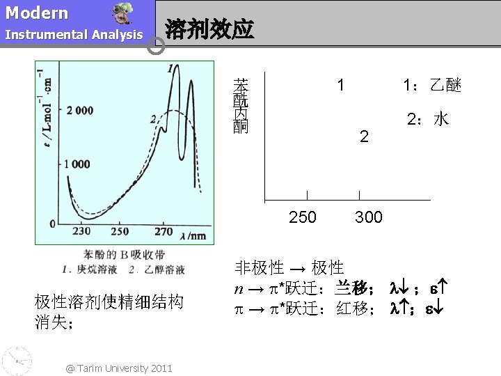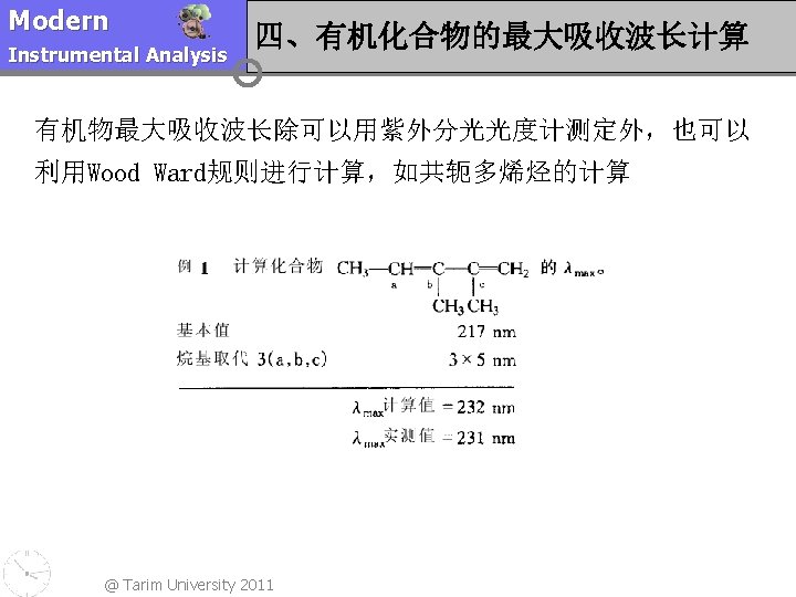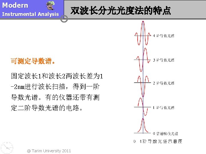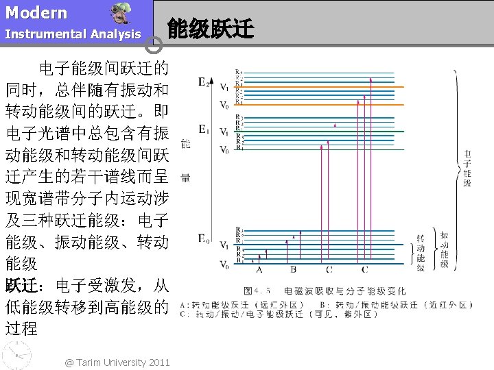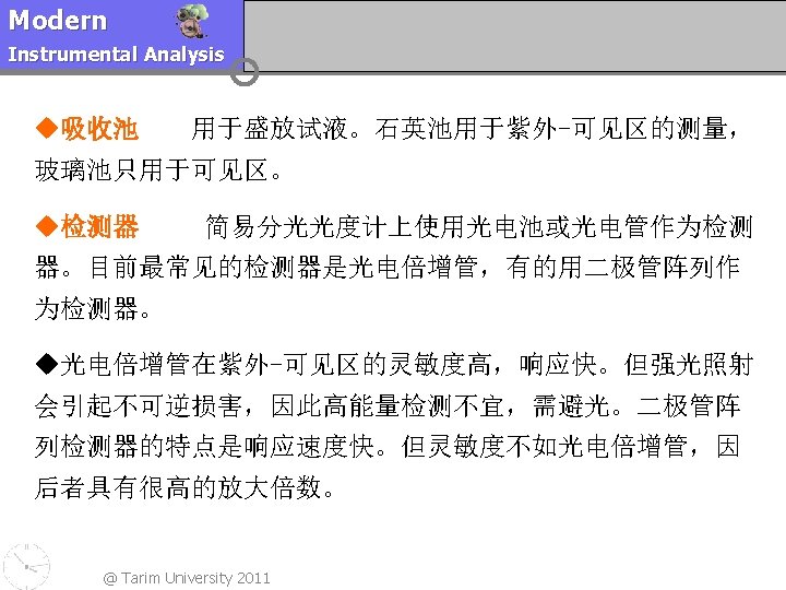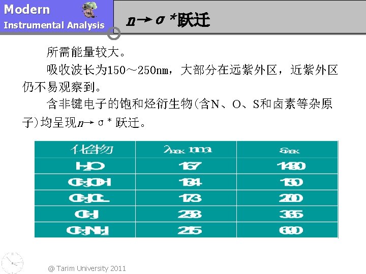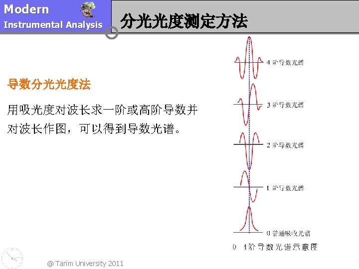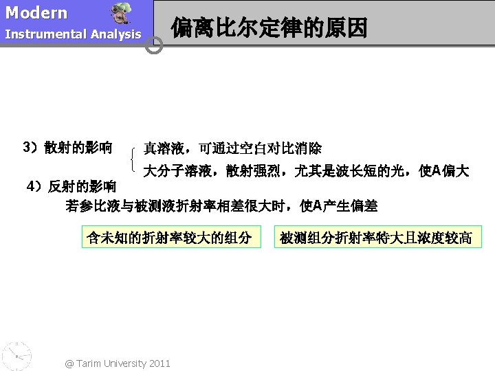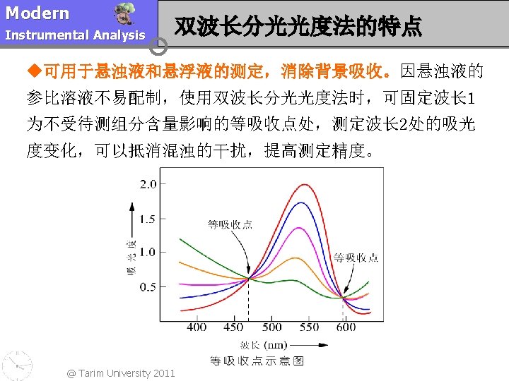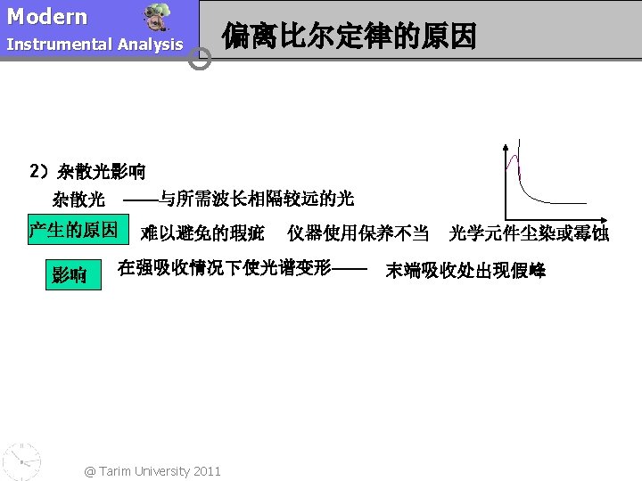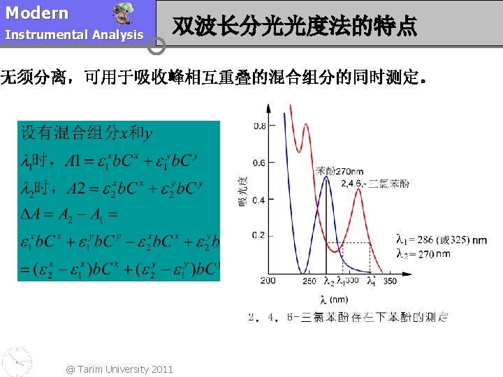 Modern Instrumental Analysis 2. 定量分析 依据:朗伯-比耳定律 吸光度: A= b c 透光度:-lg. T = b c 灵敏度高: max: 104~ 105 L· mol-1 · cm -1;(比红外大) @ Tarim University 2011