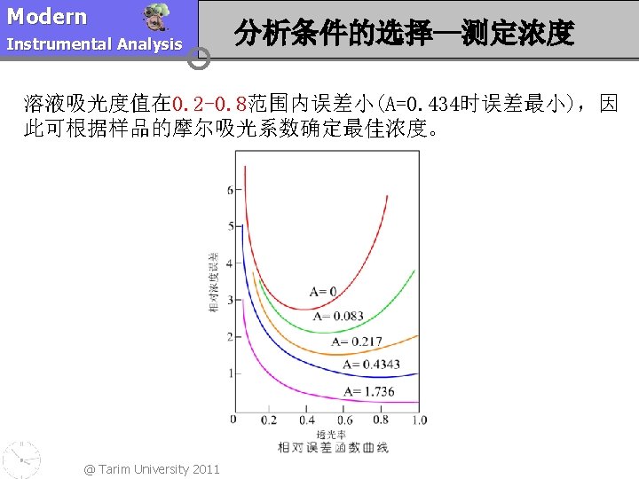 Modern Instrumental Analysis A = KC A = K C A= - lg. T= - 0. 434 ln. T C A —— = —— C A C - T曲线 作 —— C T=0. 368 @ Tarim University 2011 C A —— = —— C A ——d. T A =- 0. 434 —— T d. A =- 0. 434 T T 0. 434 T = ——— —— lg. T T T=15 -65% A=0. 434 C/C A=0. 2 -0. 8 光度误差最小 控制浓度和调 整比色皿厚度