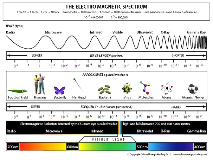 11 109 107 105 103 101 10 -3 10 -5 10 -7 10 -9 10 - Electromagnetic Spectrum gamma X-rays 500 Ultra Violet 600 Infra red microwave Radio waves 700 Violet, indigo, blue Green, yellow Orange, red Color Wave length (nm) violet 400 -435 indigo 435 -480 blue 480 -500 green 500 -560 yellow 560 -595 orange 595 -610 red 610 -750