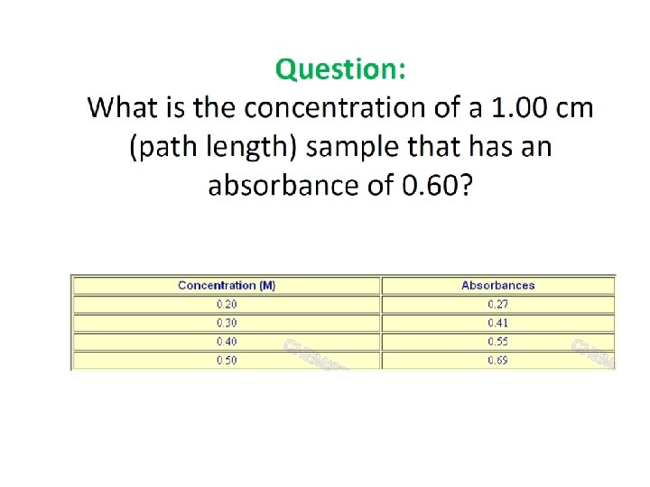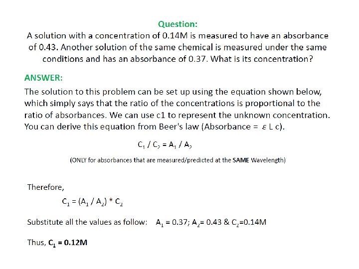 Example 1: A sample in a 1. 0 -cm cell is determine with a spectrometer to transmit 80% light at certain wavelength. If the absorptivity of this substance at this wavelength is 2. 0, What is the concentration of the substance? Solution: The percent of the transmittance is 80%, and so T = 0. 80. log 1/T =abc log 1/0. 80 = 2. 0 cm-1 g-1 L x 1. 0 cm x c log 1. 25 = 2. 0 g-1 L x c c = 0. 10/2. 0 = 0. 050 g. L-1