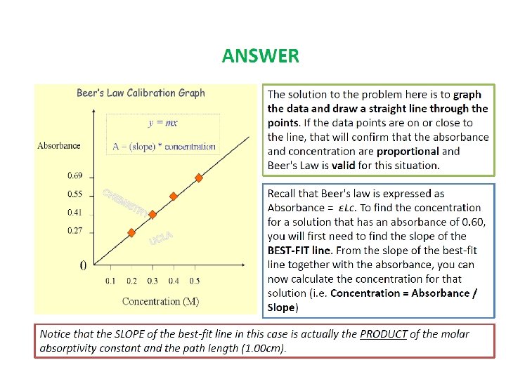 Beer’s Law Assumption/Limitation • The light being shined on the sample must be monochromatic (one color or wavelenght) • The analyte must not be participate in a concentration dependent equilibrium § This isn’t good technique for many weak acid systems, as dilution increases dissociation and HA and A- probably don’t have the same absorbance.