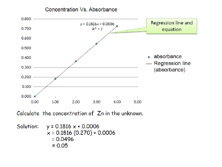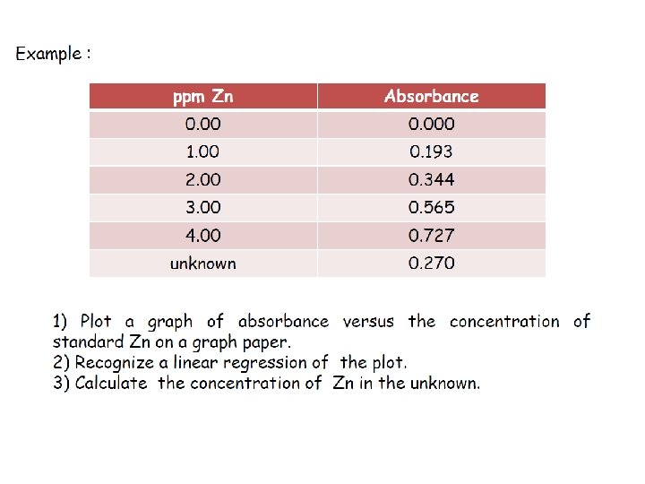 Example 2: A solution containing 1. 00 mg ion (as thiocyanate complex) in 100 m. L was observed to transmit 70. 0% of the incident light compared to an appropriate blank. (a)What is the absorbance of the solution at this wavelength? (b) What fraction of light would be transmitted by a solution of iron four times as concentrated. Solution: (a)T = 0. 700 A = log 1/0. 700 = log 1. 43 = 0. 155 (b) 0. 155 = ab (0. 0100 g/L) ab = 15. 5 L/g From A= abc A = 15. 5 L/g x (4 x 0. 1000 g/L) = 0. 620 log 1/T = 0. 620 T = 0. 240