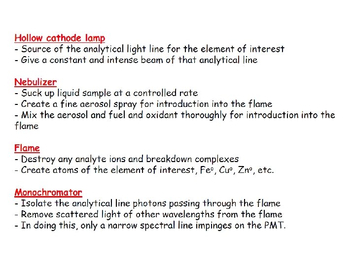 Sample Introduction in AAS Flame Method of supplying atom source Utilizes a nebulizer in conjunction with air/acetylene flame Solvent evaporates Metal salt vaporizes and is reduced to complete the atomization process Radiation source is a hollow cathode lamp