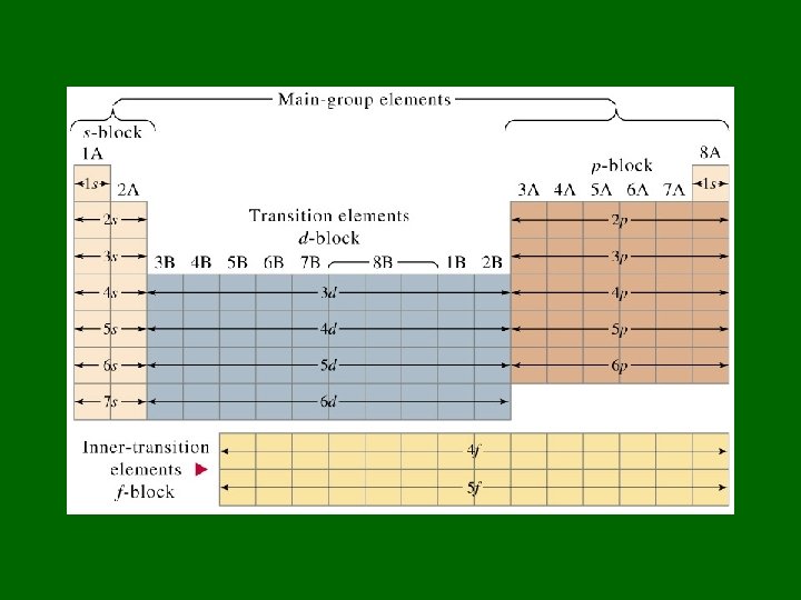 1 s 2 s 3 s 4 s 5 s 6 s 7 s 2 p 3 p 4 p 5 p 6 p 7 p 3 d 4 d 5 d 6 d 4 f 5 f 6 f Sequence of orbitals: 1 s, 2 p, 3 s, 3 p, 4 s, 3 d, 4 p, 5 s, 4 d, … Follow the arrows Exceptions do occur: half-filled orbitals have extra stability.