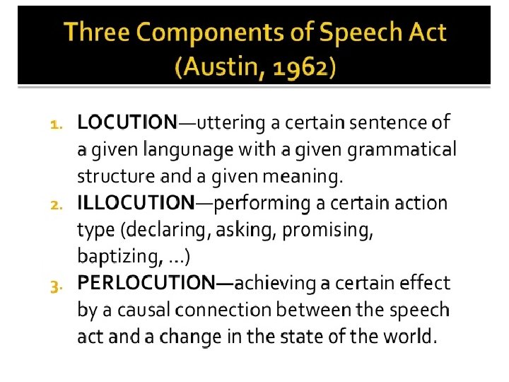 Communicative linguistics Speech-act theory is a subfield of pragmatics concerned with the ways in which words can be used not only to present information but also to carry out actions. As introduced by Oxford philosopher J. L. Austin (“How to Do Things With Words”, 1962) and further developed by American philosopher J. R. Searle, speech-act theory considers the levels of action at which utterances are said to perform: • Locutionary Acts • Illocutionary Acts • Perlocutionary Acts