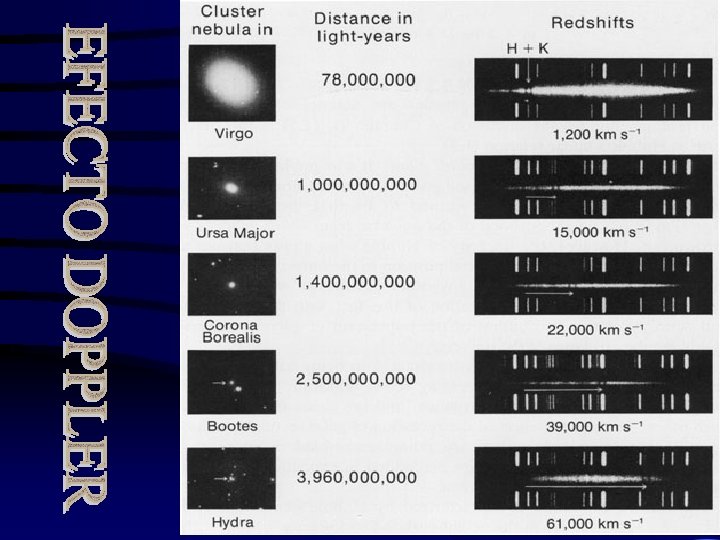 EFECTO DOPPLER Cambia , dependiendo de la dirección del movimiento de la fuente v Se acerca al observador Se observa un corrimiento al Azul: blueshift En reposo c. r. a observador v Se aleja del observador Se observa un corrimiento al rojo: redshift