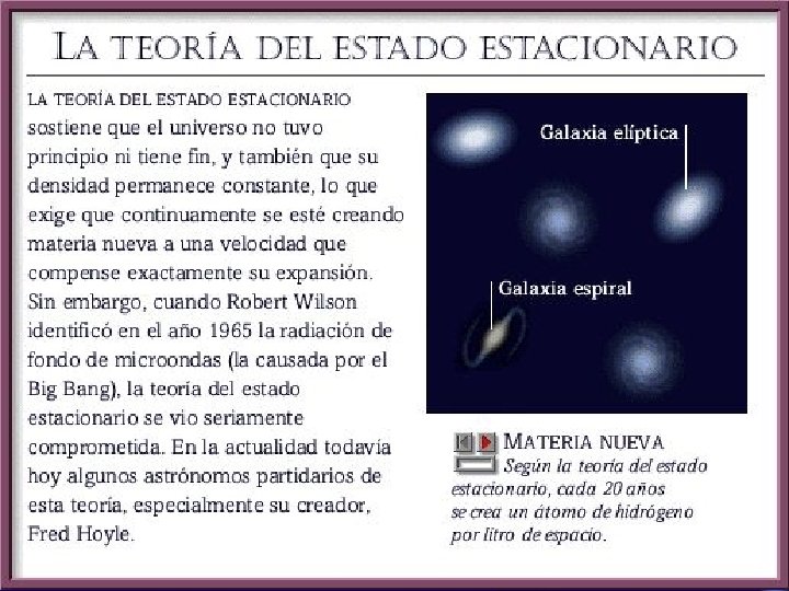 MODELO DEL ESTADO ESTACIONARIO Hermann Bondi, Thomas Gold y Fred Hoyle. Teoría que sostiene que el Universo ha sido y siempre será como es hoy. Supone que el Universo es uniforme, infinito y que no está en expansión. Requiere de creación continua de materia El descubrimiento de la Radiación de Fondo en el Universo acabó con el Modelo del Estado Estacionario
