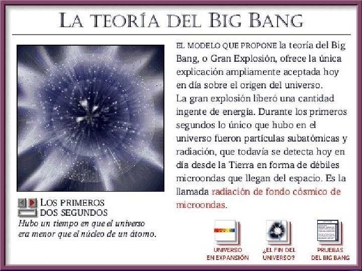Es importante recalcar que el Big Bang no es como una explosión, sino que, a partir de una "singularidad", el entramado del propio espacio es el que se expande. Con el Big Bang comienza el espacio y el tiempo, y la teoría ha sido comprobada lo suficiente como para que, en la actualidad, la gran mayoría de la comunidad científica la apoye. Recordemos el descubrimiento de Penzias y Wilson de la radiación cósmica de fondo de microondas, el "eco" del Big Bang, y más recientemente los trabajos de George Smoot basados en los datos suministrados por el satélite COBE, los hallazgos del WMAP y otros BIG BANG