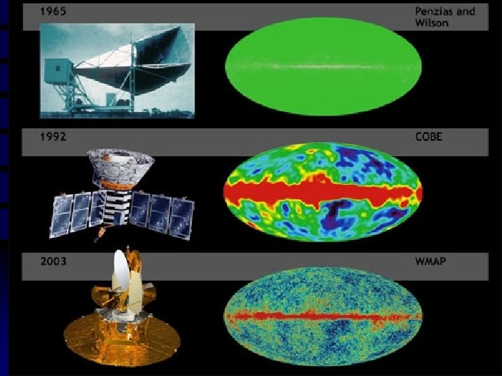 Radiación de fondo vista por COBE (1992) y WMAP (2003) • Espectro curva planckiana perfecta • Temperatura 2. 7 K, como esperado • Muy homogéneo: Fluctuaciones de 1 parte en 106 • Futura misión europea: Planck (2007)