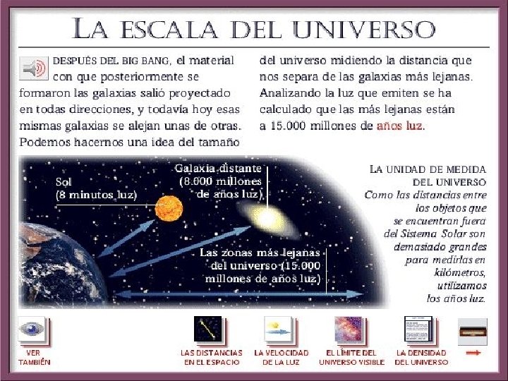 EL UNIVERSO EN UN AÑO 1 Enero 0 h 00: Big Bang 1 En. 2 h 30 m: Época de recombinación Abril: Se forma la Vía Láctea Junio: Se forma el Sol y la Tierra Diciembre: Oxígeno en nuestra atmósfera 19 Dic. : Peces 21 Dic. : Plantas, insectos, anfibios 25 Dic. : Dinosaurios 30 Dic. : Mamíferos 31 Dic. 23 horas: Aparece el hombre