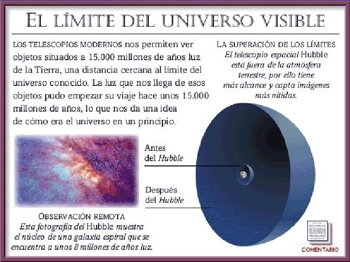 Radiación milimétrica del fondo • Fotones que se liberaron en la época de recombinación • Tenían entonces 3000 K • Han perdido su energía debido a la expansión, hasta los 2, 725 K actuales