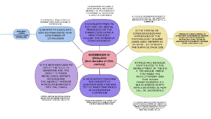 MODERNISM The literature and the arts of the early 20 th century were marked by the birth of "Modernism', a general term referring to the cosmopolitan literary and artistic movements that violently reacted against late 19 th century values. Modernism included and was influenced by different artistic movements, all of which were united in their attempt to rebel against the past and create new forms and styles in visual arts, literature and music. The main movements were: Futurism , an artistic and literary movement which rebelled against the past and decomposed the subject to create a sense of dynamism in painting; Cubism which fragmented the subject into geometrical and abstract shapes; Expressionism which was characterised by distorted forms and by radical experimentation in the use of colours to convey an idea of anxiety Surrealism which gave importance to the world of the unconscious and used art to represent it.