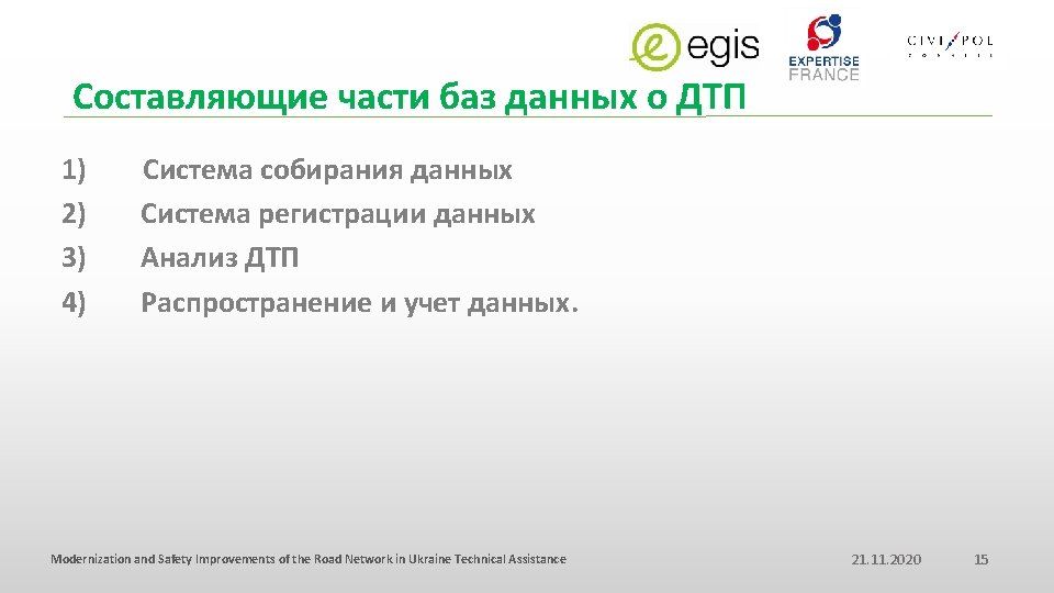 ФАКТОРЫ ВЛИЯЮЩИЕ НА ДТП - Совокупность Человек 93% 95% Human Factors Дорога 34% Автомобиль Modernization and Safety Improvements of the Road Network in Ukraine Technical Assistance 13% 21. 11. 2020 7