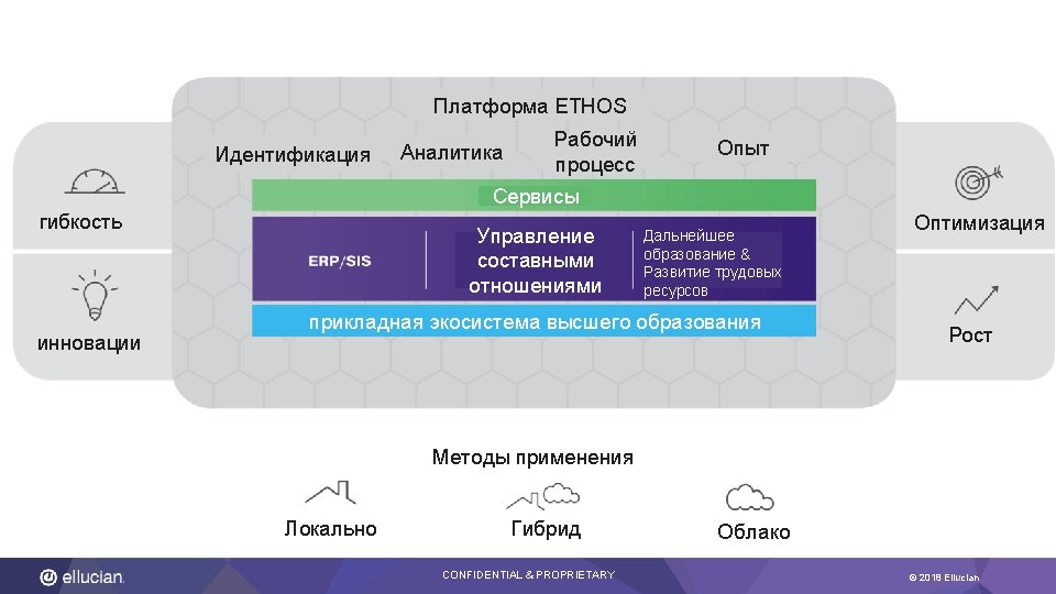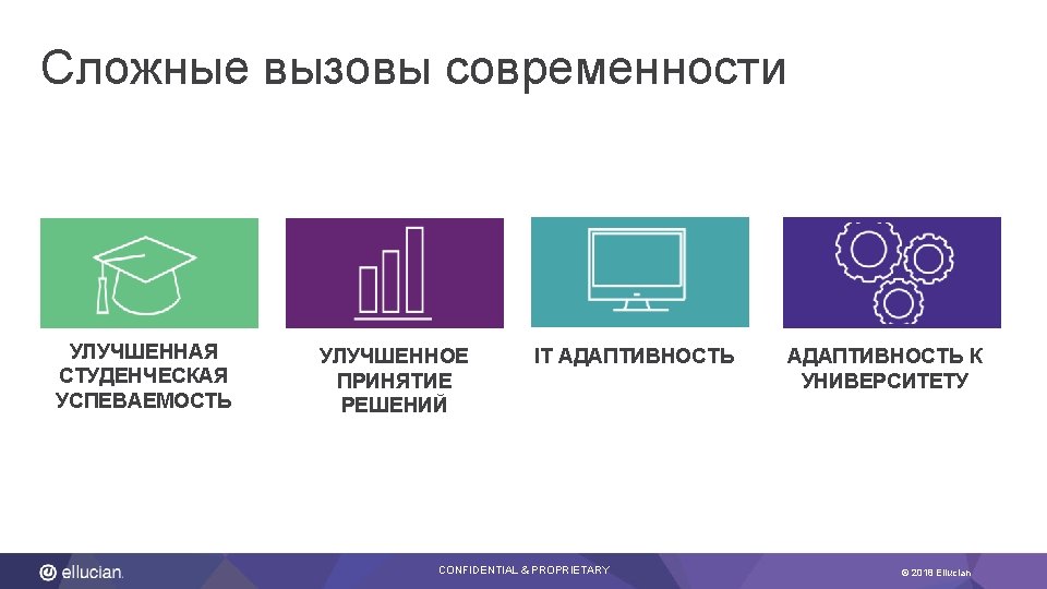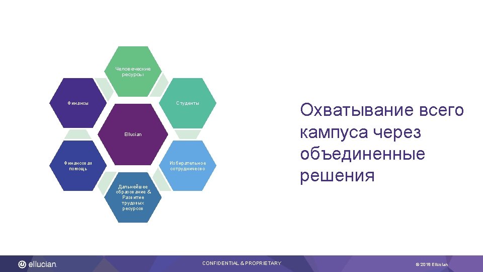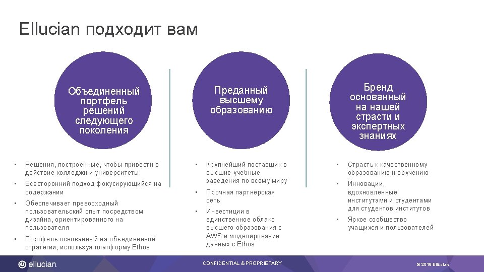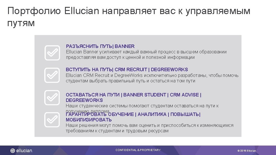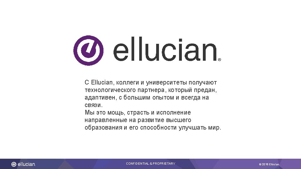 Решения, построенные, чтобы привести высшее образование в действие Robust | Flexible | Unified | Cloud-ready | Purpose-built for Higher Education CONFIDENTIAL & PROPRIETARY © 2018 Ellucian