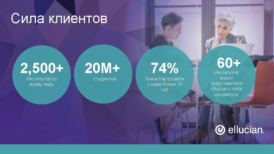 The power of customers 2, 500+ 20 M+ 74% 60+ institutions globally students of customers have been with us for 10+ years institutions have on-site Ellucian staff