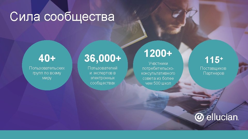 The power of community 40+ 36, 000+ 1200+ user groups worldwide members and experts in e-communities customer advisory council participants from over 500 schools 115+ vendor partners