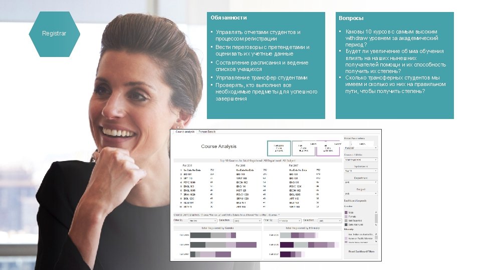 Registrar Responsibilities Questions • Handles student records and registration processes • Correspond with applicants and evaluate their credentials • Schedules classes and maintains class lists • Manage transfer students • Verifies who has completed coursework for graduation • What are the top 10 course sections with the highest withdraw rate by academic period? • Would an increase in tuition impact our current aid recipients and their ability to complete their degree? • How many transfer students do we have and how many are on track to complete their degree? Fall 2015 CONFIDENTIAL & PROPRIETARY Fall 2016 Fall 2017 © 2018 Ellucian
