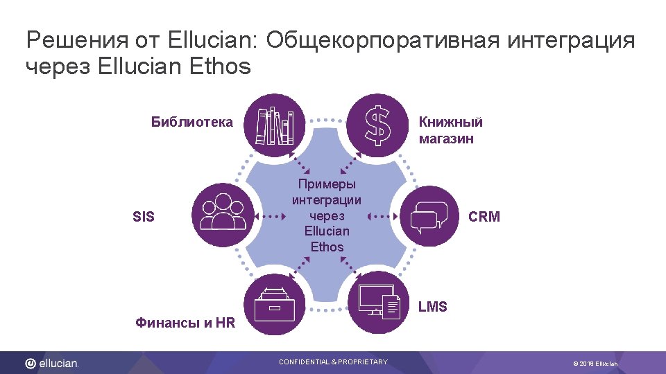 Ellucian’s Solution: Enterprise-wide integration via Ellucian Ethos Library Bookstore SIS CRM LMS Finance & HR CONFIDENTIAL & PROPRIETARY © 2018 Ellucian