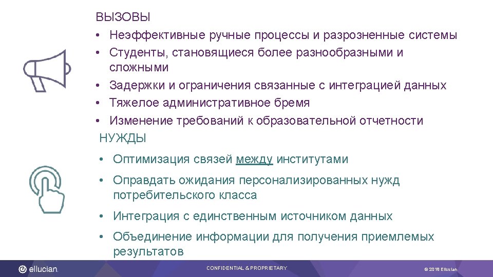 CHALLENGES • Inefficient manual processes and disparate systems • Students becoming more diverse and complex • Data integration delays and limitations • Heavy administrative burden • Changing education reporting requirements NEEDS • Streamlining interactions across the institution • Meeting expectations for personalized, “consumer-grade” experiences • Integrating with single source of data • Consolidated insights driving intelligent outcomes CONFIDENTIAL & PROPRIETARY © 2018 Ellucian