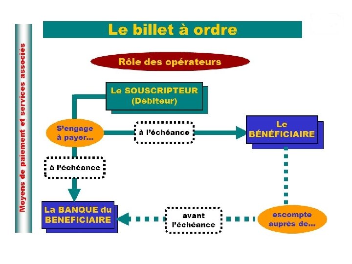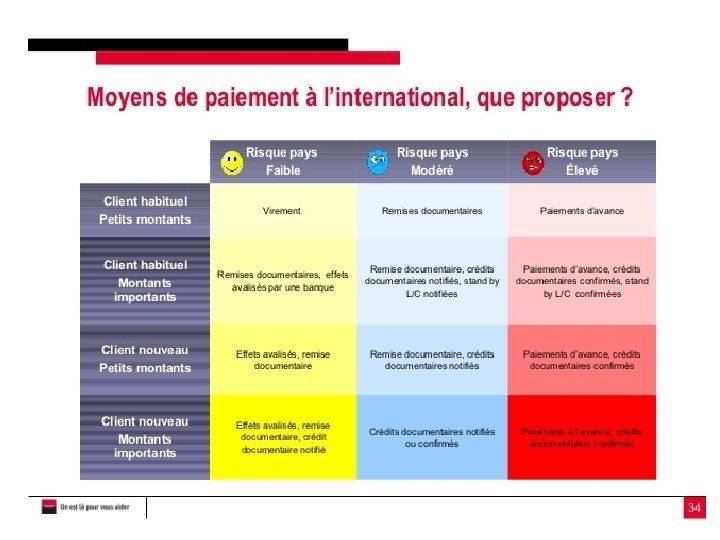 • Moyens de paiement classiques (national ) Bto. B : Notation risque Modes de paiement Espèces Cheque bancaire Carte bancaire Lettre de change (traite) Virement bancaire TT Affacturage Remise documentaire Lettre Stand By Credit Documentaire National International