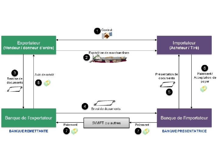 LA REMISE DOCUMENTAIRE : ØLa remise documentaire est un moyen de paiement à l’international par laquelle un exportateur (vendeur) confie à sa banque des documents avec pour instruction de ne les remettre à l’importateur (acheteur) que contre paiement ou acceptation d’effets de commerce. ØLa remise documentaire s’utilise quand la relation commerciale entre le vendeur et l’acheteur est régulière et qu’une confiance réciproque s’est créée. Cette technique assez simple et peu onéreuse ne couvre que partiellement le risque de non-paiement: Le client peut ne pas se présenter, peut refuser la marchandise, peut réussir à obtenir la marchandise sans les documents. ØLa traite peut être sans provision et l’exportateur ne pourra se retourner contre les banques.