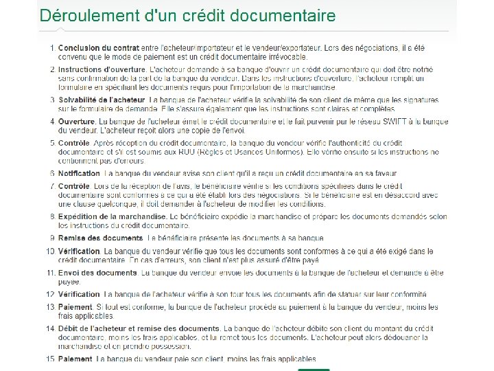 CREDOC • • Avantages Rapidité de paiement Sécurité de la transaction Grande précision Vendeur : Est certain d’être payé du montant convenu à la date prévue dans le contrat. Acheteur : Est certain d’être livré des marchandises commandées conformément à ce qui a été prévu lors de l’ouverture du crédit documentaire. • S’assure de ne pas payer le vendeur avant que ce dernier ait rempli ses obligations contractuelles. • Universalite : Cette technique est internationale Inconvenients • Pas de possibilité d’annulation, irréversible. • - Formalités administratives lourdes et complexes - Techniques parfois mal perçues par l'acheteur (marque de défiance) - Coût élevé car de nombreuses commissions sont facturées. surtout si le montant du crédit est supérieur à 10 000 €