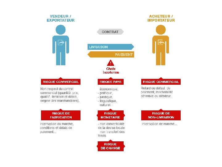 MOYENS DE PAIEMENT A L’INTERNATIONAL • Instruments de paiement : • Rares et limités : Espèces – Troc • Virement international, effets de commerce et chèque • Techniques de paiement: -Encaissement simple -Encaissements documentaires : remise documentaire contre remboursement et CREDOC - La LCSB • Couverture des risques de non paiement • Les risques encourus La prévention du risque Le transfert de risque - Credoc et LCSB : transfert du risque sur les banques - Assurance crédit : transfert du risque sur une société d’assurance - L’affacturage : transfert du risque sur un organisme financier - L’ autocouverture