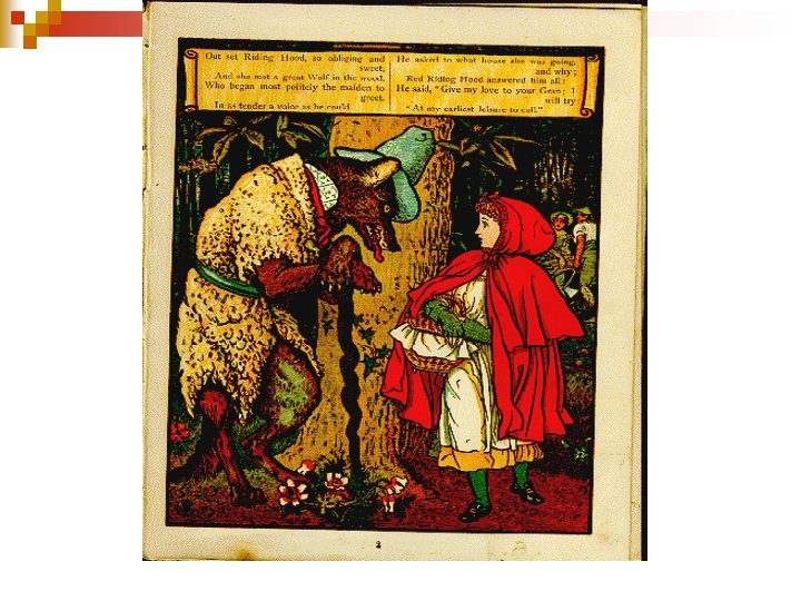 Little Red Riding Hood n n n n Grandmother, what big arms you have! The better to hug you with, my child. Grandmother, what big legs you have! The better to run with, my child. Grandmother what big teeth, you have! The better to eat you with! Upon saying these words, the wicked wolf threw himself on LRRH and gobbled her up.