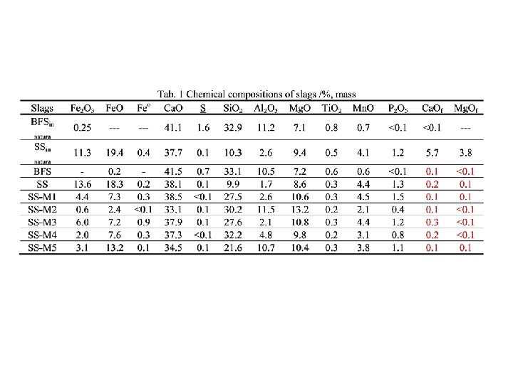 Modified Steel Slag (SS-M 1) Merwinite glassy phase RO RO phase: Ca. O glassy phase Merwinite RO wt (%) 1, 3 2 1, 5 1, 8 1, 9 1, 8 1, 5 1, 7 2, 4 1 1, 3 at (%) 1, 5 2, 3 1, 7 2, 1 2 2, 2 1, 8 2 2, 8 1, 1 1, 3 (*) Fe as Fe 2 O 3 Mg. O wt (%) 16, 5 12, 8 15, 7 11, 5 26, 6 7 9, 5 12, 6 10, 4 16, 9 29, 5 Fe. O at (%) 25, 9 20, 6 24, 8 18, 7 39 11, 7 15, 6 20, 3 17 26, 5 42, 6 wt (%) 66, 1 67, 9 66, 8 67, 3 57, 8 73, 2 71, 3 67, 6 71, 2 66, 9 53 Mn. O at (%) 58, 2 61, 3 59, 2 61, 3 47, 6 68, 7 65, 8 61, 1 65, 3 58, 8 42, 9 wt (%) 16, 1 17, 2 16 19, 4 13, 7 18 18 18, 2 15, 9 15, 3 16, 1 at (%) 14, 4 15, 7 14, 4 17, 9 11, 4 17, 2 16, 8 16, 7 14, 8 13, 6 13, 2 Mg. O/Fe. O (at %): – 0, 2 and 0, 45 Mg. O/Fe. O Could prevent volume soundness