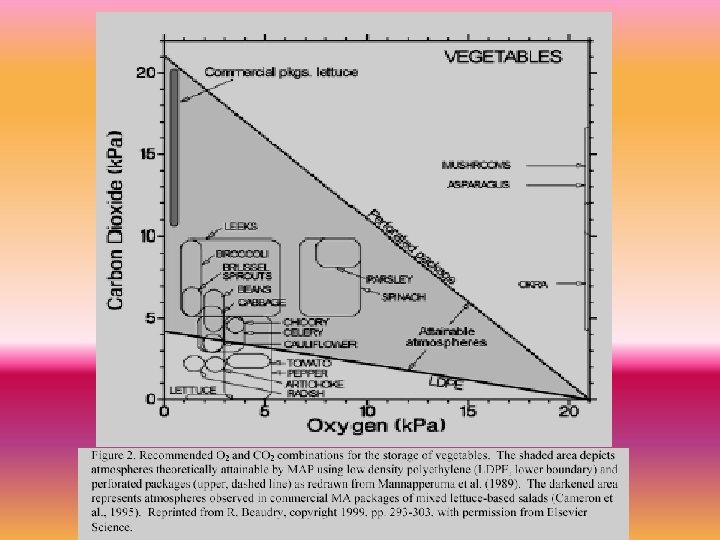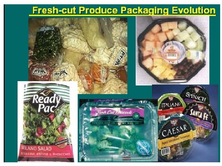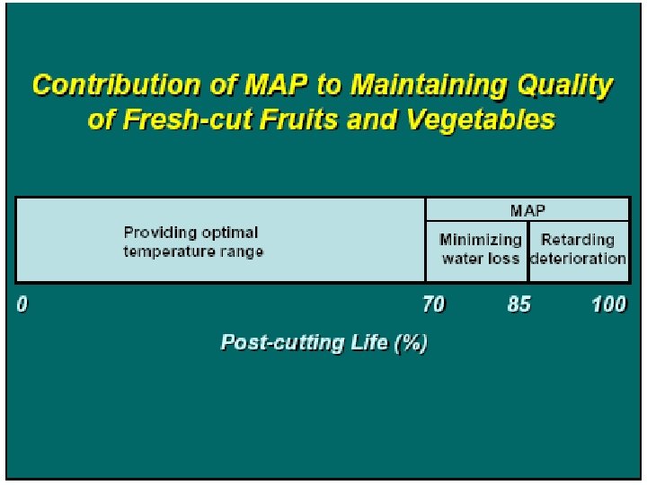 Modified humidity packaging • RH in a plastic package is usually very high. • Reduction in RH to an optimal amount may be critical for the success of MAP • Research: Ca. Cl 2, Sorbitol, Na. Cl, xylitol and KCl sealed with one mature tomato fruit at 20 C in simulated package for 48 days resulted in stable RH of 35, 75, 80 and 85%, respectively. • RH was a function of the ratio of chemical and fruit mass • The storage life of package red-type tomato fruit at 20 C was extended from 5 days using no pouch to 15 -17 days with a pouch containing Na. Cl.