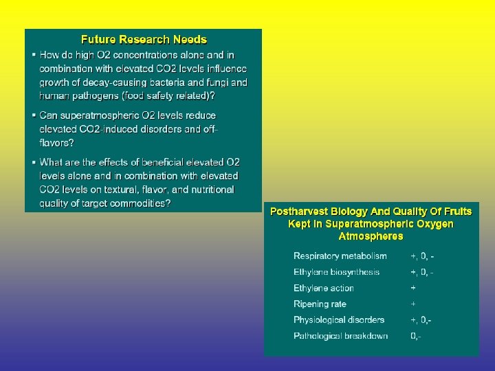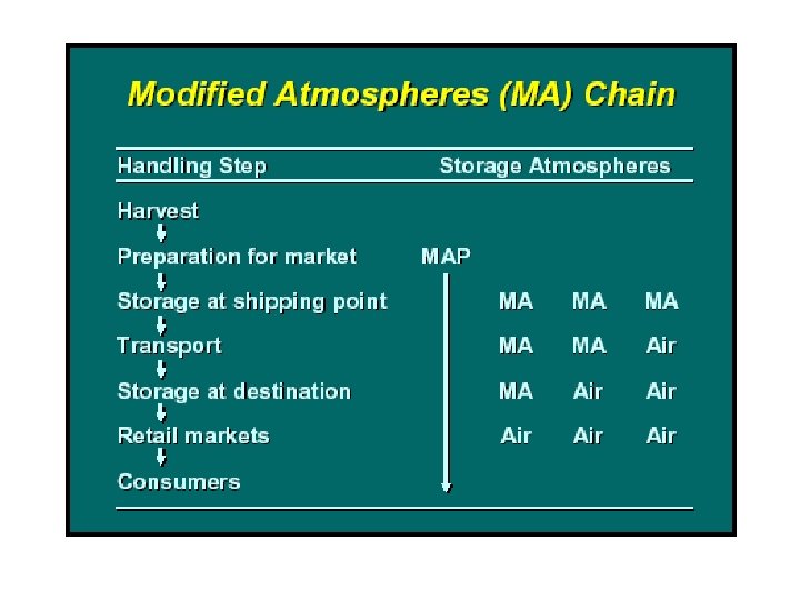 Kader et al. (2002) Potential benefits • Retardation of senescence • Reduction of fruit sensitivity to ethylene action • Alleviation of certain physiologiical disorders • Directly and indirectly affect postharvest pathogens • Useful tool for insect control in some commodities Potential harmful effects • Initiation or aggravation of certain physiological disorders • Irregular ripening of fruits • Off-flavor and off-odors • Susceptibility to decay may increase • Sprouting and retardation of periderm development are stimulated in some root and tuber vegetables, such as potatoes.