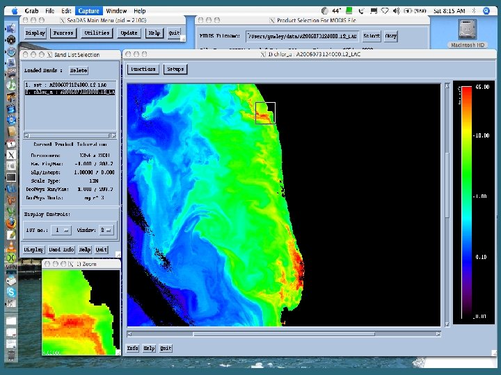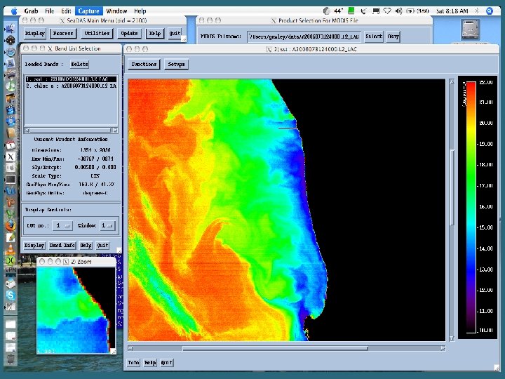 Sea. DAS General Features: · User-controlled display scaling · Multiple frame buffers for image display · Interactive annotation generation · Histogram and color bar · Color manipulation, multiple concurrent color tables, density slicing · Cursor location and data displaying · Image data spreadsheet for raw and/or geophysical values · Image looping/movie · Scatter plot/contour plot/profile plot · Data display across multiple bands · Bathymetry generation · Arithmetic band functions · X-Y shifting · User-defined band operations · Postscript, PNG output image formats. · ASCII, HDF SD, and binary flat file output data formats.