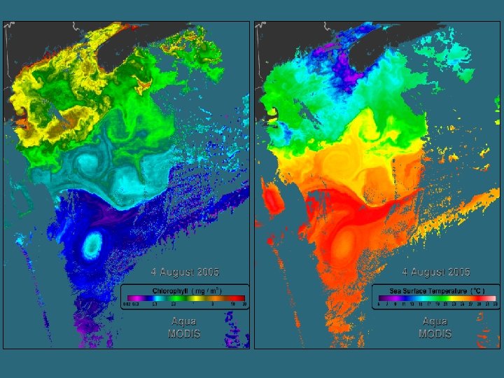 MODIS Atmospheric Correction for Ocean Bands Statement of the problem: • Total radiance observed by the satellite is composed of 5 -10% ocean signal and 90 -95% atmosphere signal. • The atmospheric and ocean surface scattering effects must be accurately modelled and removed. • Desired parameter is normalized water leaving radiance (n. Lw) for MODIS bands 8, 9, 10, 11, 12, 13 (0. 412, 0. 443, 0. 488, 0. 531, 0. 551, 0. 667 microns) Aerosol model selection: • Assume zero (or negligible) water leaving radiance in the NIR bands (15 and 16; 0. 750 and 0. 865 microns); remainder is from aerosols. • This is extrapolated to visible wavelengths using aerosol models. • For case 1 waters, NIR bands are used to select aerosol model. • Where this assumption is not valid, water-leaving radiance in NIR bands is estimated and removed prior to aerosol model selection.