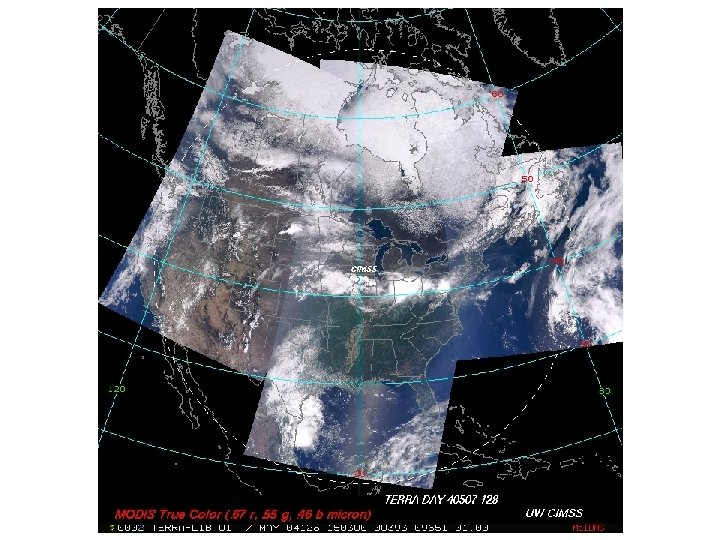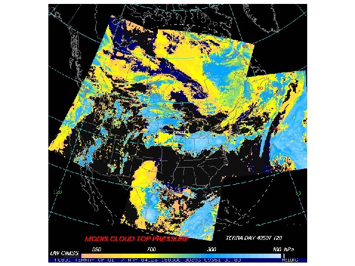Cloud Top Properties Menzel, Wylie - CIMSS • Cloud Top Pressure, Temperature, Emissivity derived using CO 2 “slicing” • MODIS product utilizes 4 spectral channels in the 13 – 14 m region. • 5 x 5 1 km pixel retrievals where at least 5 of the 1 km pixels are cloudy as determined by the cloud mask • Cloud properties retrieved both day and night