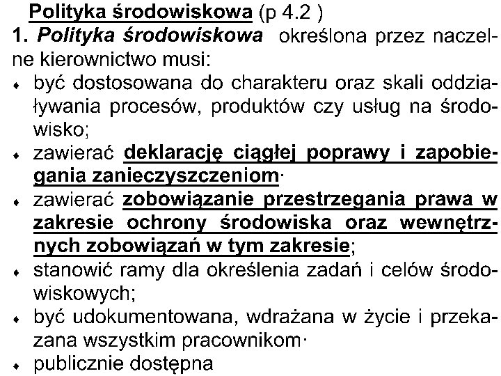 Polityka środowiskowa (p. 4. 2) • Najwyższe kierownictwo przedsiębiorstw rzadko faktycznie opracowuje treść polityki środowiskowej, a jeszcze rzadziej traktuje ten dokument jako wyznacznik strategii przedsiębiorstwa w zakresie ochrony środowiska. Ma to negatywny wpływ na motywację pracowników. Udział najwyższego kierownictwa ma zwykle wyłącznie charakter deklaratywny.