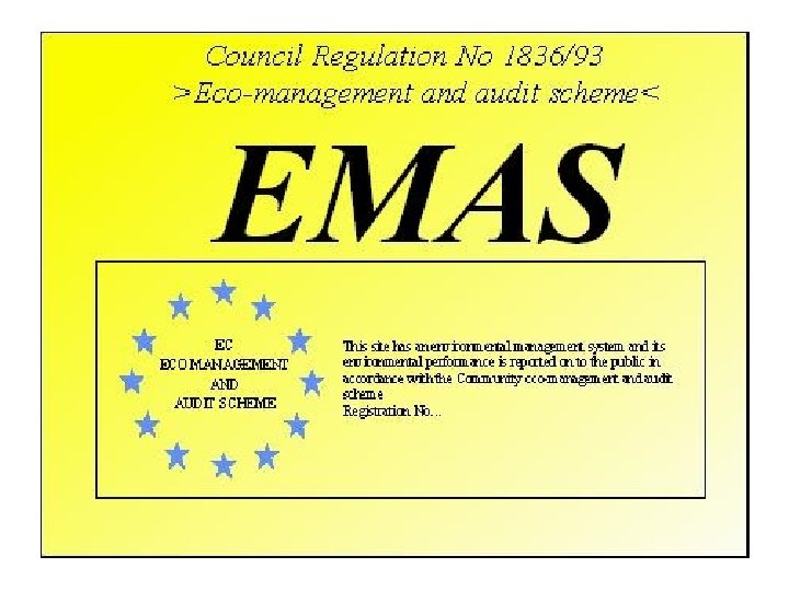 Co to jest EMAS? n Europejski System Ekozarządzania i Audytu (EMAS) jest Rozporządzeniem Komisji Europejskiej. n Rozporządzenie EMAS jest obowiązujące we wszystkich krajach członkowskich UE lecz przystąpienie organizacji do EMAS jest dobrowolne.