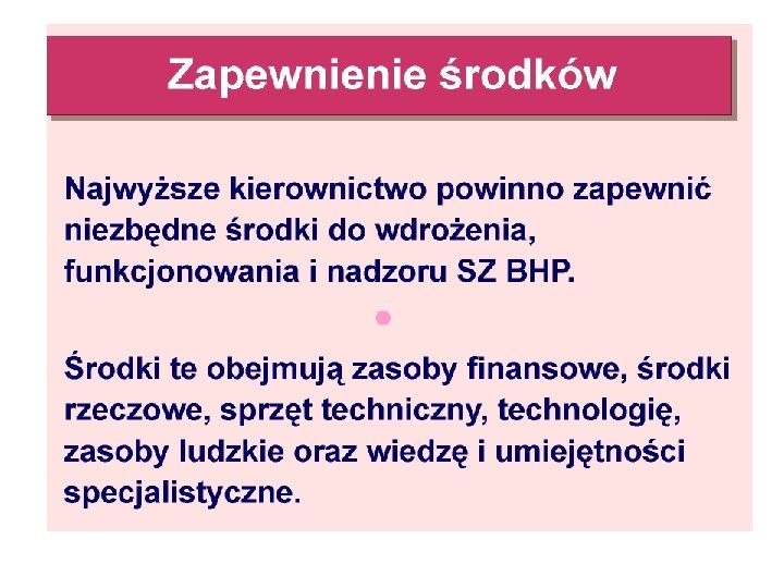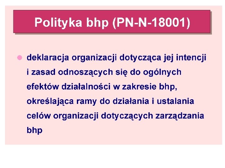 STANDARDY DOTYCZĄCE SYSTEMÓW ZARZĄDZANIA BHP - zadeklarowanie postępowania zgodnego z wymaganiami normy PN-N 18001; - dążenie do uzyskania potwierdzenia organizacji zewnętrznej zgodności systemu zarządzania BHP z wymaganiami normy PN-N 18001 (1)PN- N-18001: 2004. Systemy zarządzania bezpieczeństwem i higieną pracy. Wymagania PKN, Warszawa 2004.