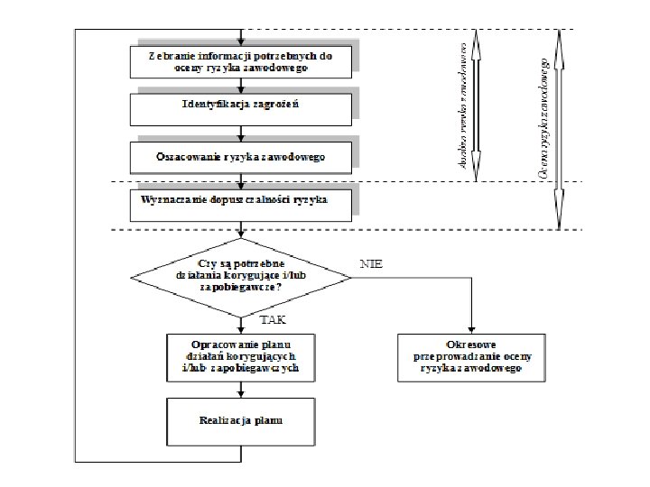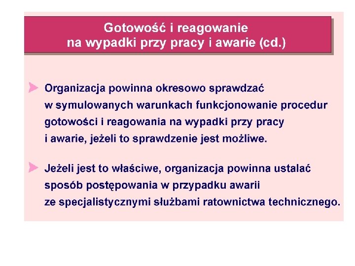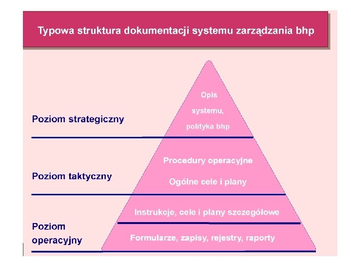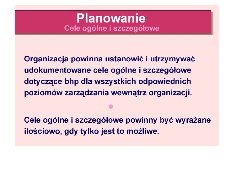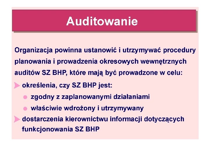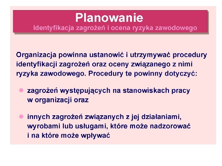 Wymagania dotyczące systemu zarządzania BHP (punkt 4 PN-N-18001) Wymagania ogólne 1. Zaangażowanie kierownictwa oraz polityka bezpieczeństwa i higieny pracy 2. Planowanie 1. Wymagania ogólne 2. Identyfikacja zagrożeń i ocena ryzyka zawodowego 3. Wymagania prawne i inne 4. Cele ogólne i szczegółowe 5. Planowanie działań 3. Wdrażanie i funkcjonowanie Struktura, odpowiedzialność i uprawnienia Zapewnienie środków Szkolenie, świadomość, kompetencje i motywacja Komunikowanie się Dokumentacja systemu zarządzania bezpieczeństwem i higieną pracy Sterowanie operacyjne pracami i działaniami związanymi ze znaczącymi zagrożeniami Gotowość i reagowanie na wypadki przy pracy i awarie • Sprawdzanie oraz działania korygujące i zapobiegawcze Monitorowanie Auditowanie Zapisy Niezgodności oraz działania korygujące i zapobiegawcze • Przegląd wykonywany przez kierownictwo i ciągłe doskonalenia