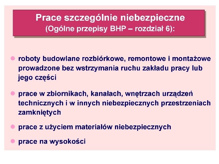 STANDARDY DOTYCZĄCE SYSTEMÓW ZARZĄDZANIA BHP W wyniku podjętych prac w RP ustanowiono serię norm dotyczących systemu zarządzania BHP, obejmującą w chwili obecnej cztery dokumenty: 1. PN-N 18001: 2004. Systemy zarządzania BHP. Wymagania. 2. PN-N 18002: 2000. Systemy zarządzania BHP. Ogólne wytyczne oceny ryzyka zawodowego. 3. PN-N 18004: 2001. Systemy zarządzania BHP. Wytyczne. 4. PN-N 18011: 2006. Systemy zarządzania BHP. Wytyczne audytowania.