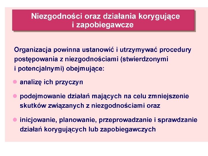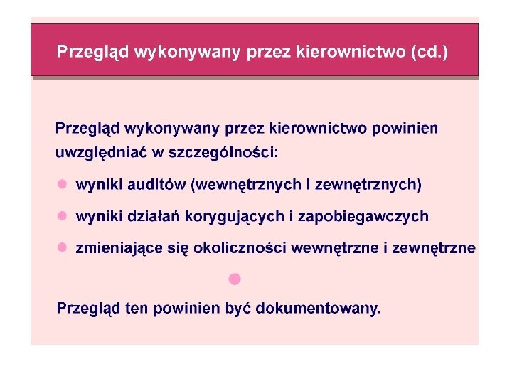 Cele, zadania i programy (p. 4. 3. 3) • Cele sformułowane w sposób uniemożliwiający stwierdzenie faktu osiągnięcia. Brak mierzalności celów jest najczęściej przejawem asekuranctwa kierownictwa przedsiębiorstwa • Cele ograniczają się do osiągnięcia zgodności z wymaganiami prawa – podejście takie, może być zaakceptowane tylko w przypadku przeprowadzenia uzgodnień ze służbami ochrony środowiska ustanawiających okres dostosowawczy dla przedsiębiorstwa • Umieszczanie w programie zarządzania zadań już zrealizowanych