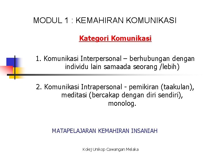MODUL 1 : KEMAHIRAN KOMUNIKASI Kategori Komunikasi 1. Komunikasi Interpersonal – berhubungan dengan individu lain samaada seorang /lebih) 2. Komunikasi Intrapersonal - pemikiran (taakulan), meditasi (bercakap dengan diri sendiri), monolog. MATAPELAJARAN KEMAHIRAN INSANIAH Kolej Unikop Cawangan Melaka